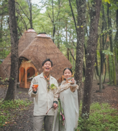 決められた演出をなぞるのではなく、おふたりがありのままでいられる時間を、森とともに紡いでいく。「結びの日」が提供するのは、誰かに「魅せるための儀式」ではなく、おふたりの想いが自然とにじみ出るための、小さなきっかけなのだと感じます。火のゆらぎ、風の音、土や木の温かな感触。自然の中に身をゆだねることで、日常の役割や緊張がそっとほどけていく感覚は、きっと忘れられない体験となるでしょう。