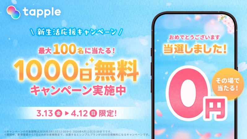 内容:期間中にタップルに登録し、アプリ内バナーより抽選に参加した方の中から、最大100名様に1000日間のシンプルプランをプレゼント