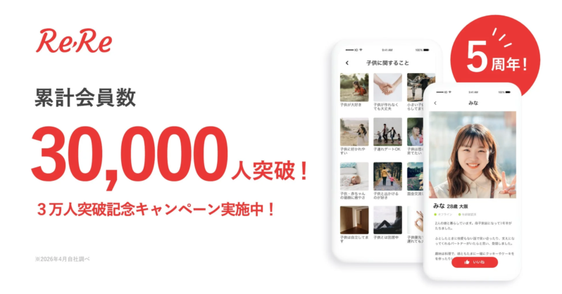 このたび、ReRe(リリー)では、サービス開始5周年と累計会員数30,000人突破を記念し、特別なキャンペーンを実施いたします。新しい一歩を踏み出すきっかけを探している方にとって、この機会は大変魅力的ではないでしょうか。